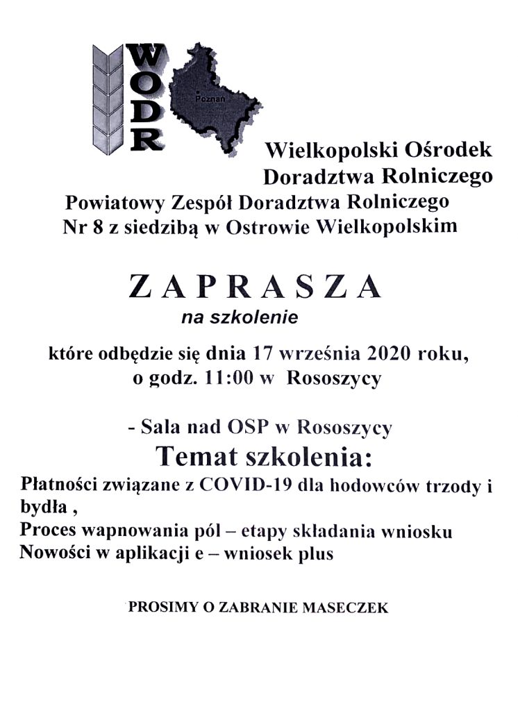 Wielkopolski Ośrodek Doradztwa Rolniczego – Powiatowy Zespół Doradztwa Rolniczego nr 8 z siedzibą w Ostrowie Wielkopolskim. Zaprasza na szkolenie, które odbędzie się dnia 17 września 2020r. o godzinie 11:00 w Rososzycy (sala nad OSP).